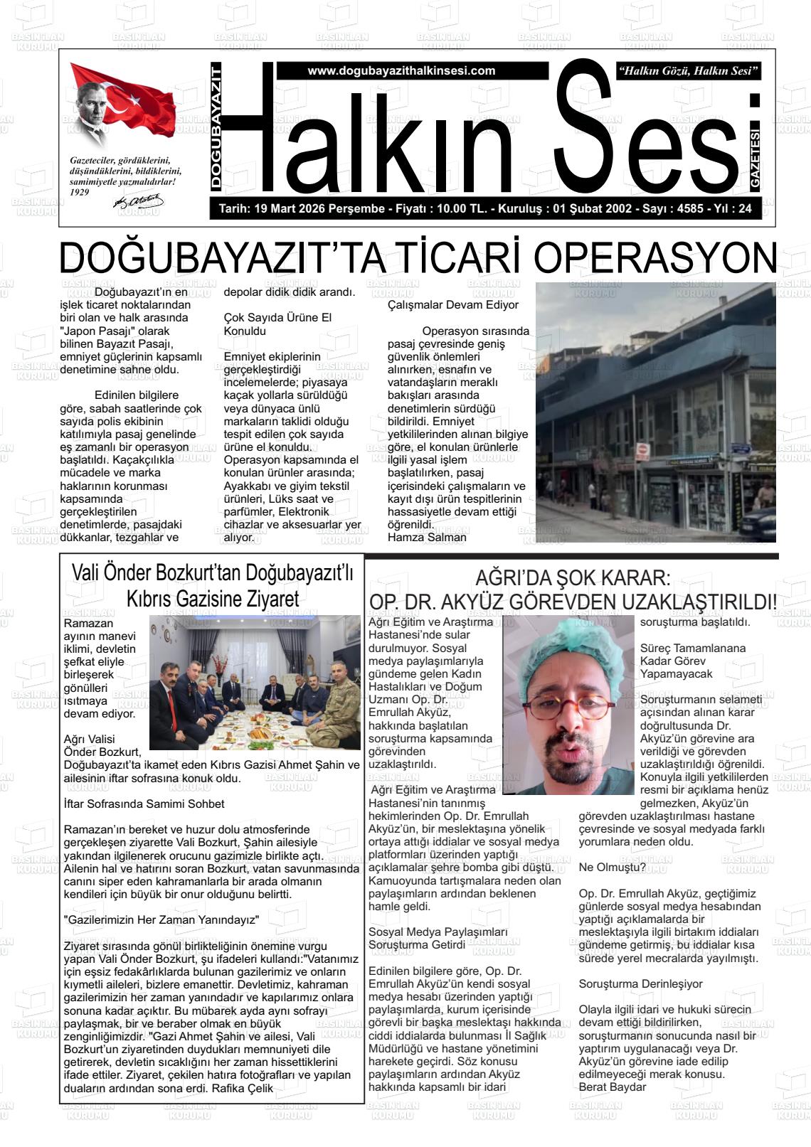 Ağrı Yerel Gazeteleri 19 Mart 2026, Perşembe Günü Manşeti
